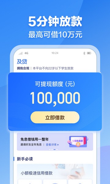 当您用自己手机下载及贷App后,进入借款入口,点击立即激活额度→填写资料→获得额度。最快2分钟到账,最高10万额度。