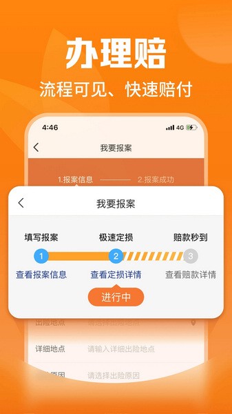 【办理赔】一键报案,快速拿到赔款,时时了解理赔进度。
