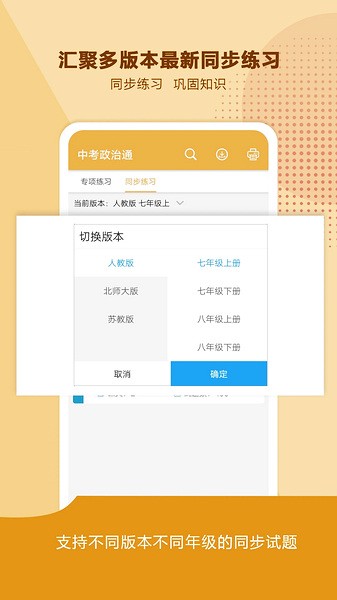 1、打开中考政治通App,在首页可设置中考倒计时,也可以选择七、八、九年级练习并切换教材版本,快速进入教材学习。