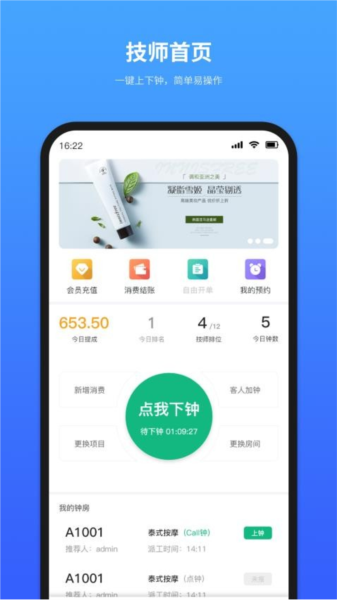 4、简单操作体验: 支持用户在线进行简单操作,技师可以自由上下钟,提高工作灵活性。