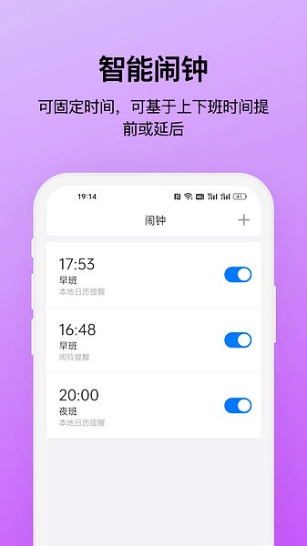 贴心的班次闹钟,可以按不同班次设置多种闹钟。