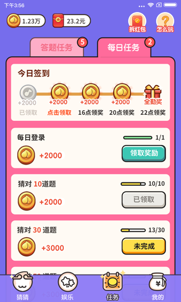 软件里有各种各样的题目,比如明星、歌曲、电影、电视剧等等,既能娱乐又可以学习知识。最让我喜欢的是它的界面设计很简单明了,操作起来特别流畅。而且每天都有不同的活动和任务,奖励也很丰厚。我觉得这个APP不仅适合休闲娱乐,还能在不知不觉中学到很多东西,真的挺值得推荐的!