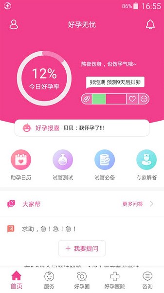 好孕无忧针对用户所处的备孕、试管婴儿、怀孕三种状态,为用户定制病程记录、管理、提醒;根据用户健康状况,科学预测试管婴儿成功概率;根据用户月经、基础体温等数据,精准分析排卵日,帮助用户科学备孕生子无忧。