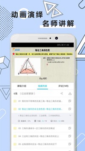 初中数学全套精讲APP是一款主打初中数学在线学习辅导的软件,界面简洁清爽,功能丰富强大,网罗各地教材版本,汇集海量数学课题,囊括集合、代数、因式分解、方程等,帮助初中各个阶段学生全面进行学习提升!且每个课程都有名师详细讲解,并配以动画生动演绎,让题目讲解能更有效!同时用户还能随时进行查看学习进度,轻松有效管理!