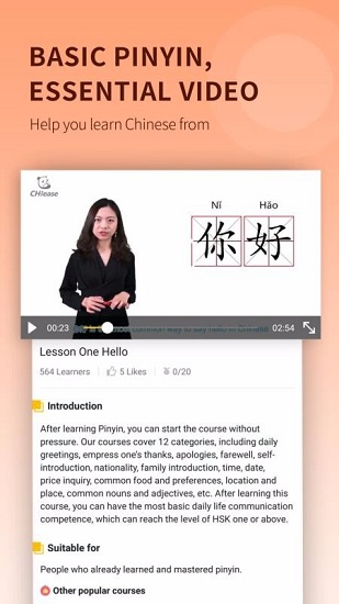 汉易APP是一款由广州五行教育科技有限公司打造的汉语学习软件。该软件专为外国友人打造,提供了非常丰富的汉语课程,您可以在这里轻松找到自己想要学习的课程内容,快速提高自己的汉语知识水平。