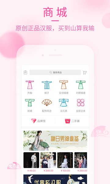 4、商品”板块更加值得一提——不仅分类细化,而且在同袍们考虑购买同一形制的汉服时,可以货比三家,不同商店的价格和特点在屏幕上一目了然。