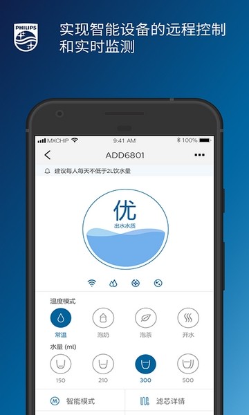 飞利浦水健康APP支持飞利浦净水器、净饮机、热水器、智能马桶等智能物联设备的统一管理和智能操控,一个APP集成全屋的智能水生活系统,用户可以通过APP远程监测和智能控制,随时随地监测设备的使用情况、使用数据,并进行远程的操作和设置,智能、安全、舒适、健康,全面保障用户高品质的智慧居家生活体验。
