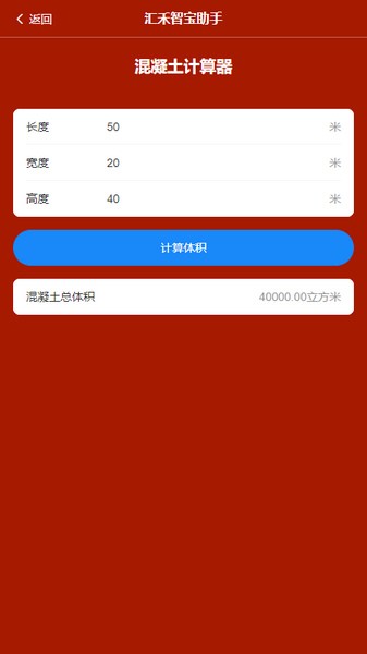 在混凝土计算器工具中可输入混凝土的长度、宽度、高度数值计算混凝土的总体积。