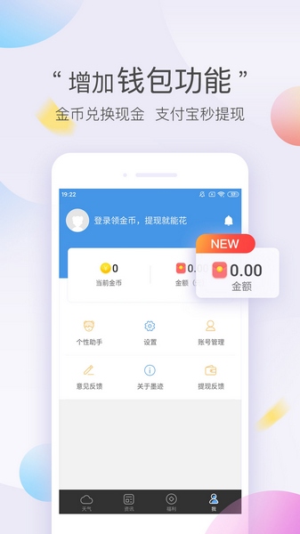 【看天气还能得现金】每日登录即可领取金币,金币可兑换现金,快速提现至支付宝。