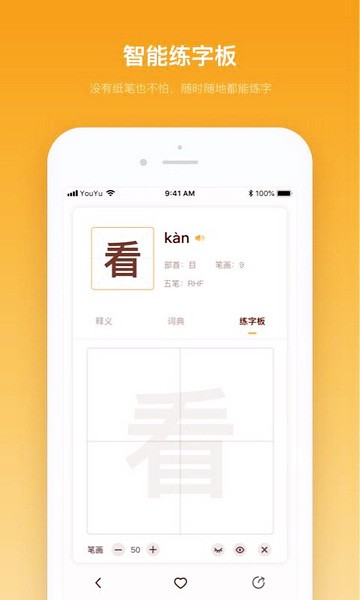 7、练字板:单字查询提供练字板功能,没有纸笔也不怕,随时随地就可练字。