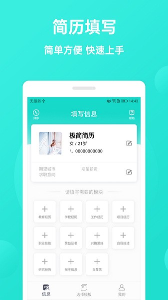 启动app后,在“信息”页面(即首页),填写个人的简历信息。填写要点: