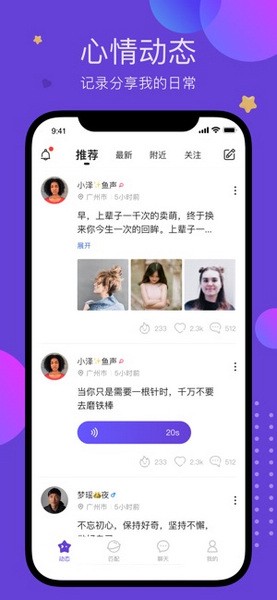 心情动态:在网上发布专属心情动态,记录美好生活,实时到同一个城市附近交朋友更方便。