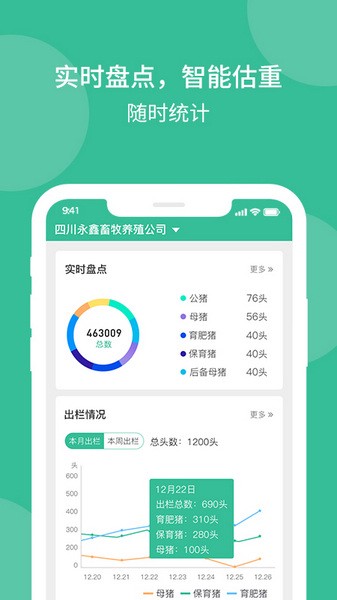 4、【管理】:通过移动端管理您的养殖场、人员和企业,数字化管理。您可以轻松分配工作、实时统计猪场信息、跟进养殖情况,视频观看喂养情况。