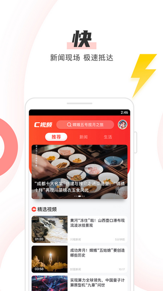 C视频是四川日报全媒体出品的定位快速阅览的微视频新闻客户端。以快速、精选、深度、沉浸为产品定位。以短小精悍的短视频为主,包含国内国际新闻的核心现场,以简洁的产品架构,为用户提供多样化、多维度的优质短视频新闻内容。