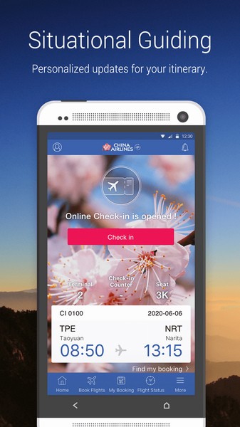 预办理登机手续:开通华航国际航线航班,在起飞前1.5-24小时使用华航app预办理登机手续,节省排队时间!