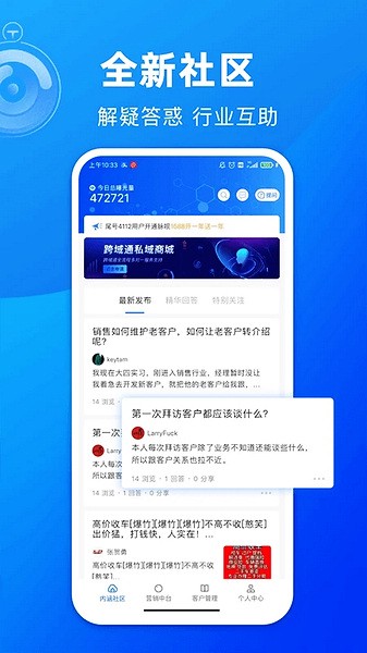 让我印象深刻的几个点是:首先,人脉广场功能可以导入大量C端数据流量,搭建跨行业交流桥梁;其次,私域交互推广通过算法扩大传播范围,让商情广告不仅仅局限于朋友圈,还能传播到更多地方。还有大数据采集功能也很实用,智能“推荐+搜索”功能比传统的线下拓展方式更高效。