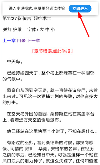 3、在进入小说的阅读页面后,可以看到最上方会出现“进入小说模式,享受更好阅读体验”的提示,这个时候大家就可以点击上方的“立即进入”按钮,这样就可以直接进入小说模式了;