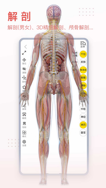 详细的医学数据库:软件包括人体十二大系统的3D解剖、经络穴位和反射区,同时提供大量肌骨康复动画,全部三维体验,界面精美,内容专业,操作体验佳。