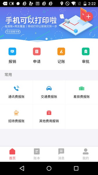 友报账app官方版是一款专门为企业打造的报账和管理平台,集报销、申请、记账和审批等多项功能于一体,一键即可完成招待费、差旅费以及交通费等内容的报账。软件界面简洁美观,功能却非常的强大,还有详细的账本可以为大家详细记录每一笔报账的订单。友报账简单便捷的记账功能则可以让员工们轻松记下每一笔订单,大大简化了审批和报销的流程。