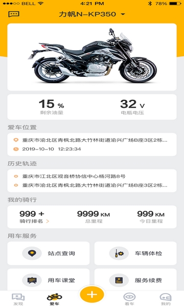 软件特色包括“发现”、“爱车”、“看车”等板块,覆盖了从记录骑行生活到了解新车资讯的全方位需求。用户可以通过绑定车辆,随时掌握爱车状态,享受智能化的服务体验。APP界面简洁直观,操作流程清晰,尤其在车主认证和车辆绑定方面设计贴心。