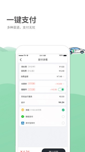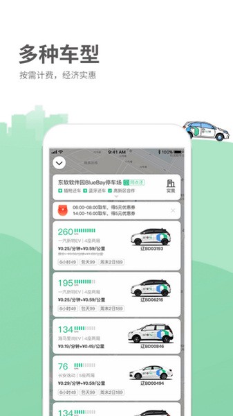 分时租赁车型均为纯电动汽车,新能源,零排放。