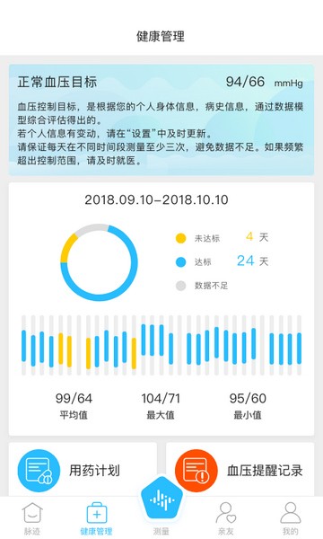 【曲线图】:以曲线图、饼图、直方图等多项图表为您展示血压控制情况,并且对血压异常进行提示;