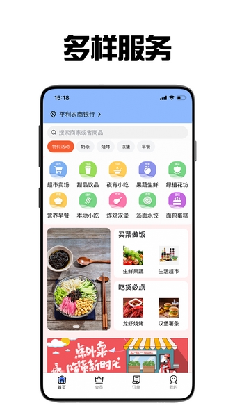 3.美食外卖,中式快餐、炸鸡汉堡、餐厅翻炒、营养早餐、下午茶等美食可在线订购;