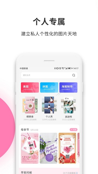 2、海报大片,支持图片海报制作。 海报动起来~ 图文并茂的海报!模板多多,可以修改模板上的文字、替换图片,修改背景色等。