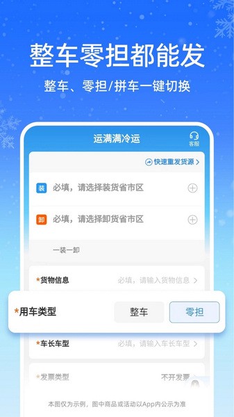 运满满冷运是一个专门为冷链物流运输行业设计的找车平台,提供多种冷链运输服务,包括整车、专线和零担等类型,还有丰富的车型选择,从面包车到大货车应有尽有。平台上还有专业的在线客服随时答疑,无论是货主还是企业都能在这里找到适合自己的物流解决方案。