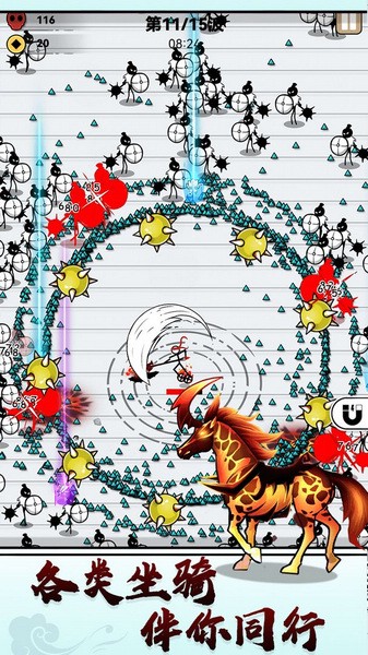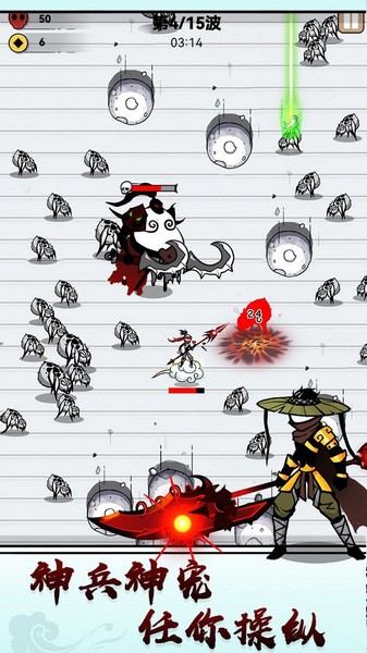 纸上弹兵是一款休闲解压的动作oguelike类割草游戏,游戏主要以火柴人为题材,还采用了非常具有中国风特色的水墨画风。玩家们在游戏中可以操控火柴人来进行战斗,通过升级火柴人的搭配技能,强化角色的属性以及各种灵活的走位来躲避敌人的进攻。而且每击败一个敌人时,玩家都可以获得相应的经验,升级后就可以不断的解锁更多的武器和技能,回旋镖、流星锤等武器都能对敌人造成更大的生孩,让玩家可以更加轻松地击败场景中的敌人。
