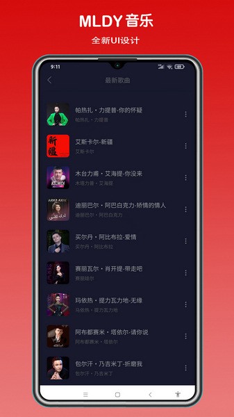 mldy音乐是一个新疆音乐平台的听歌软件,为用户提供歌曲串烧,歌手介绍,第一时间查得到新疆电视台晚会、最新mv,最新单曲等而且绝大多是免费的,乐队介绍等内容。