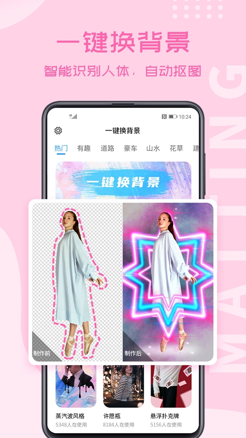 自动识别图片中的人体,自动抠图,多种类型背景模板任你选,换背景一键完成