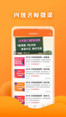 英语四级宝典APP是一款为冲击四级考试的小伙伴准备的一款智能化学习软件,平台集合了多种功能,囊括听力、单词、翻译、阅读、写作、模拟考试等,拥有专业的口语测评系统,学习资源丰富齐全,不仅收集了历年听力真题,还搭配了四、六级名师的课程指导、解析,助你顺利通关。