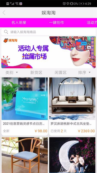 2、提供丰富的物料产品,需要的活动用品都能掌上采购,为用户提供交易平台;