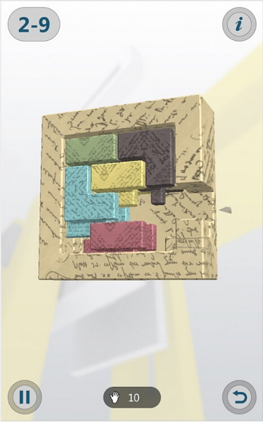 玩法烧脑的解锁,挑战大脑极限。音乐轻快灵巧,舒缓心情。孔明锁游戏非常考验玩家的脑力和眼力。孔明锁,相传是三国时期诸葛孔明根据鲁班的发明,结合八卦玄学的原理发明的一种玩具,曾广泛流传于民间。现在它来到了安桌平台上,亮丽的3D表现效果,25个不同难度的关卡。你想来感受一下古代劳动人民的智慧吗?