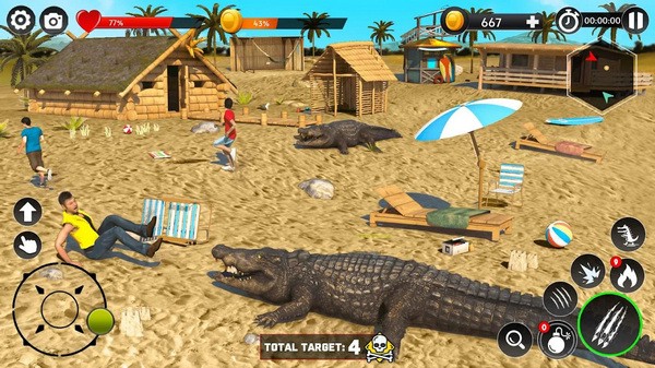 2、你的目标不是人而是鳄鱼哦,它们霸占了海滩,你要做的就是用枪将它们射杀;