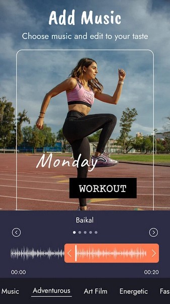 由于该应用程序主要使用图像来添加到模板中,因此它们不会有任何声音。所以可以加一首歌,让视频更有印象。不同主题的音乐播放列表会出现在你眼前,包括本地歌曲。此外,当您点击一个关键词时,会出现一个相应的列表,您将只选择其中最好的部分包含在视频中。