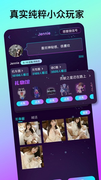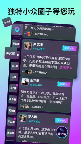 微乐园是一款专为小众圈子爱好者打造的社交软件,用户可以在这里轻松找到志同道合的朋友,在线分享交流和发布动态。这款App汇聚了各种不同的小众文化圈层,比如你可能感兴趣的亚文化和先锋领域,这里聚集了一群热爱这些独特文化的先行者,大家会一起分享、交流并探索更多有趣的圈子文化。