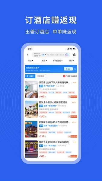趣出差支持全国40多万家酒店预订业务,通过智能算法推荐符合差旅标准的酒店。