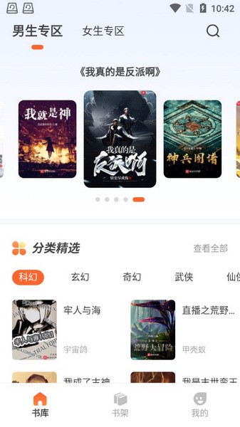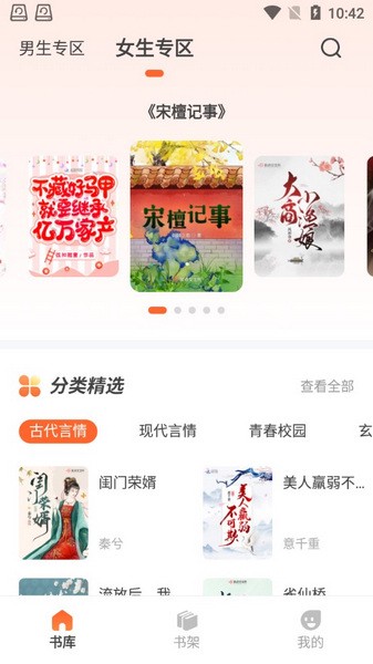 5、女生专区有:古代言情、现代言情、青春校园、玄幻奇幻、武侠仙侠、科幻