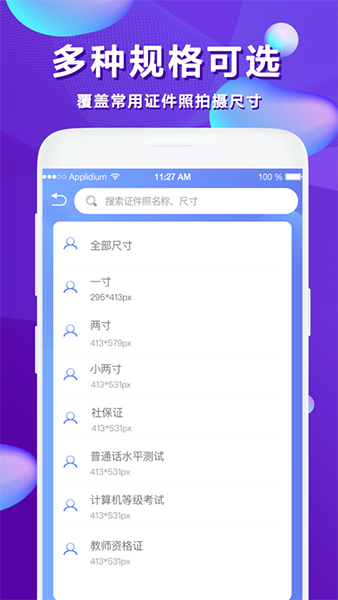 3、多种规格:目前已支持500多种专业证件照,满足大部分证件照拍摄需求