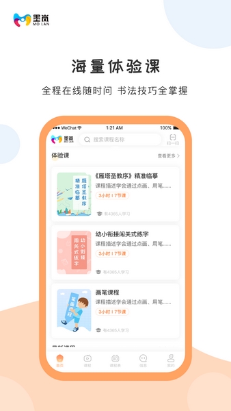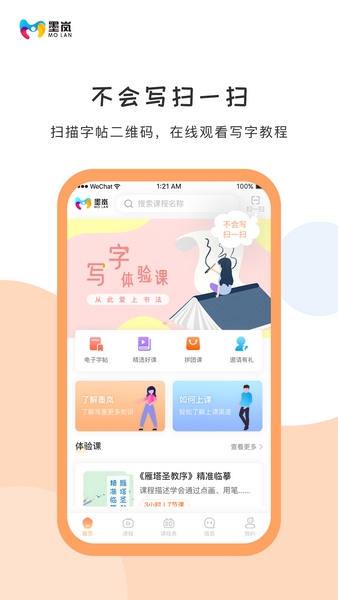 墨岚教育是一款主打儿童书法学习的软件,其采用在线教学形式为孩子们提供一对一教学,且师生在线即可互动,即问即答,解决疑问,且书法字体类型丰富,硬笔书法、毛笔书法、篆书、隶书、楷书等随你挑选,在完成教学作业后,还能将其进行提交,老师在线批改指正,让孩子更加快速的进行学习,更实用!