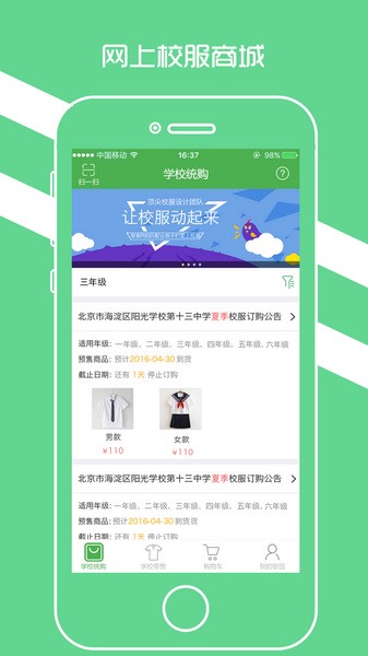 2、快捷方便,买个校服要记着报名?记着交钱?NO,使用阳光智园随时随地订购。点一点,坐等校服送到手;