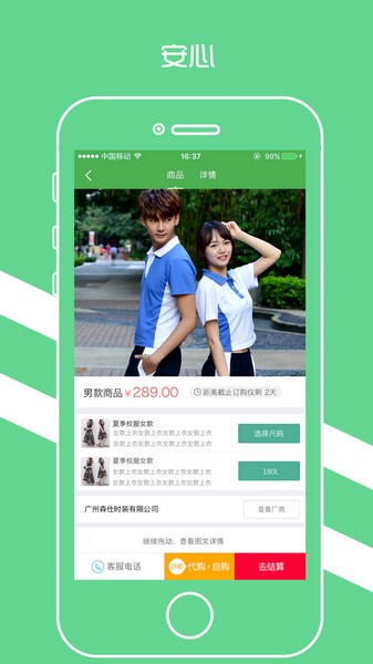 3、可靠舒心,在线申请换货、退货。自己买的校服号尺码不合适、质量有问题……,确认后直接发起售后服务,安享优质服务;