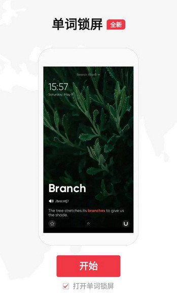 2.跳转至【单词锁屏】页面后,点击右上方滑块或者是下方的【开启】按钮均可启用单词锁屏功能。