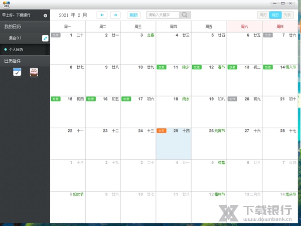 365日历客户端是一款电脑桌面日历软件,该软件能够为你电脑提供一套完整地日历查看,帮助提醒用户每一天的安排事项。还可以与网站在线日历和手机日历同步,数据都会永远保存完整,不会丢失。而且软件小巧,简洁占用 极小内存,安全绿色放心,方便每一位用户查询日历时间。同时软件还设有插件,可以将你的生日时间录入进去,到时候将会提前几天通知你,不仅如此,软件还自带农历阳历时间,让你不在搞混日期。