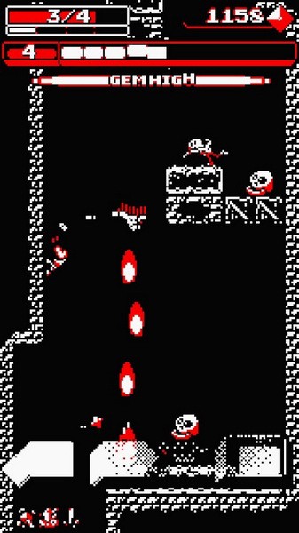 3、「靴枪」可说是本作最大的特色之一,玩家可以透过这个武器不停地朝向下方发射飞弹,同时避免在跳跃过程中受到怪物的袭击。随着关卡的推进,玩家将可升级或是更换不同的靴枪,利用不同的攻击模式深入更深层的地底挑战强大魔物。