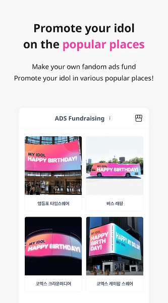 - 在IDOLCHAMP,您可以通过为粉丝广告筹集资金来为您想要的户外广告的艺术家加油。