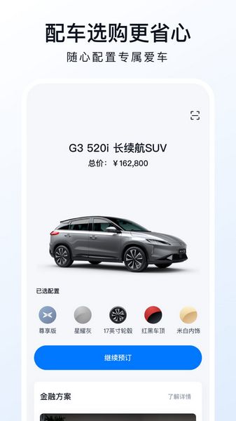 足不出户秒购新车,在线设计你的小鹏;个性定制、金融服务、快速支付,省钱省事更贴心。