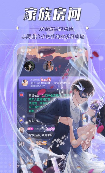 呱呱星球app是一款专门为年轻人打造的语音交友平台,大家不仅能够轻松找到属于自己的灵魂伴侣,还能够和其他的用户们进行实时的匹配连麦。此外,软件还为大家准备了非常多趣味小游戏,真正帮助陌生人之间更快的破冰。作为一款非常值得尝试的线上交友平台,呱呱星球APP甚至还有举办线上婚礼的功能,绝对能够带给大家完全不一样的交友体验。